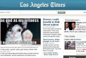 • Today’s top story: LOLcats are awesome. Among the usual stories of politics, business, and school shootings, today’s LA Times featured an entire article about I Can Has Cheezburger, the internet’s leading provider of pictures of cats with poorly written captions. It’s actually an interesting read; I never really considered that people are making a living off of internet fads. The owner of the site also has an awesome name: Ben Huh. Huh? Huh. (I found this via Tony Pierce’s Twitter).