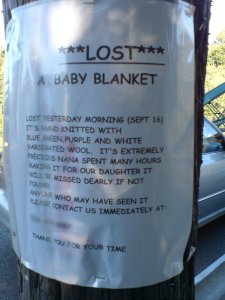 I have a beige and orange (my eyes! my eyes!) knitted throw that my “nana” made for me. It’s utterly hideous. But if I were to lose it, I’d probably put up signs.