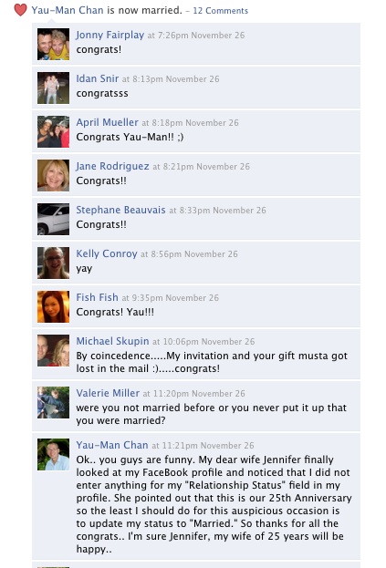 This next one comes from my good friend Yau-Man Chan, who you may remember as one of the awesomest, most likeable people on TV in Survivor: Fiji (where he was robbed; fuck you Dreamz) and Survivor: Fans vs. Favorites. I know we are good friends because he is on my Facebook friends list. Here, you can see that all former Survivor contestants are also good friends with each other. And how snarky Michael is. You may remember him from when he toppled head first into a fire in Survivor: Australia.
