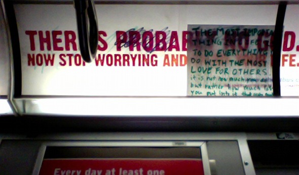 Um. Maybe I’m not fully understanding the author’s intention, but the sign (er, piece of paper) they put on top of the ad really isn’t at odds with the ad. It’s a bit ambiguous, scratching out “prob” and covering “bly no go” with the sign (“there’s a D?”) But the message that love is the most important thing is something most atheists would agree wholeheartedly with. With no supernatural being demanding faith, of course love for others is the most important thing there is. It’s all there is.