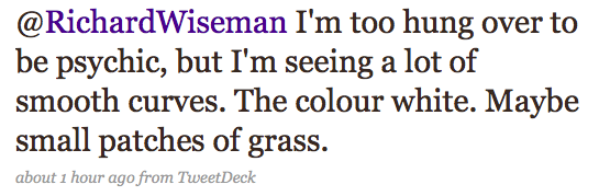 Once again, I took part in Richard Wiseman’s fun but flawed Twitter remote viewing study. Here’s what I tweeted when he said he was at the location: