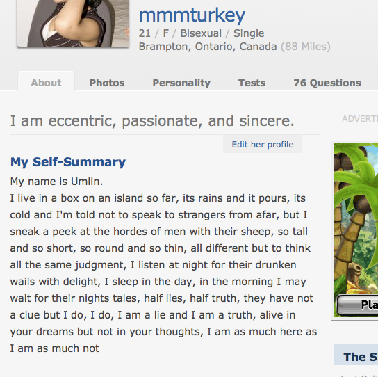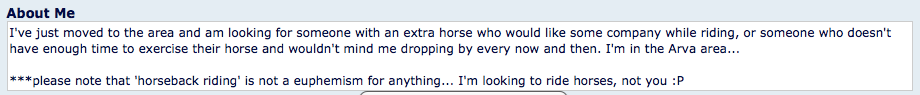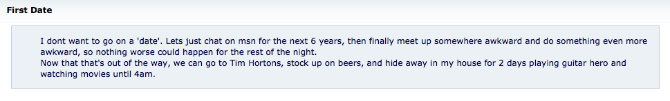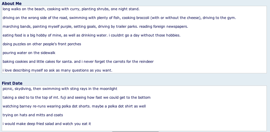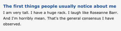 Not everyone on internet dating sites is deeply flawed (since I’m on them AMIRIGHT?CRICKETSETC). So this time, instead of making fun of poor people’s grammar, I’m going to highlight some profiles that are sort of awesome.