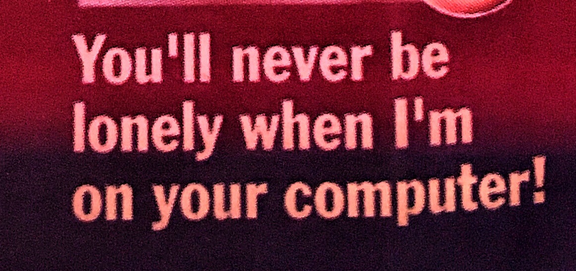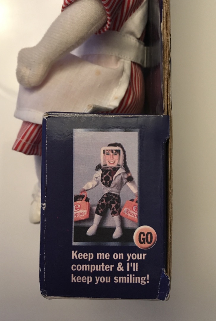 Apparently computers were seen as so soul-sucking that you needed another fake computer on top to “keep you smiling.” With the idea of social media still a few years off, the only companionship to be found while surfing the web was a doll named E-Male who cruelly imitates your boyfriend, promising “you’ll never be lonely when I’m on your computer.”