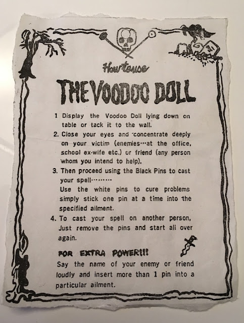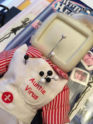 I said Auntie Virus has layers, so let’s go one layer deeper. You may have noticed that she has pins sticking out of her chest. Those weren’t mentioned anywhere on the box, were they? Oh, what have we here … the doll came with a note: